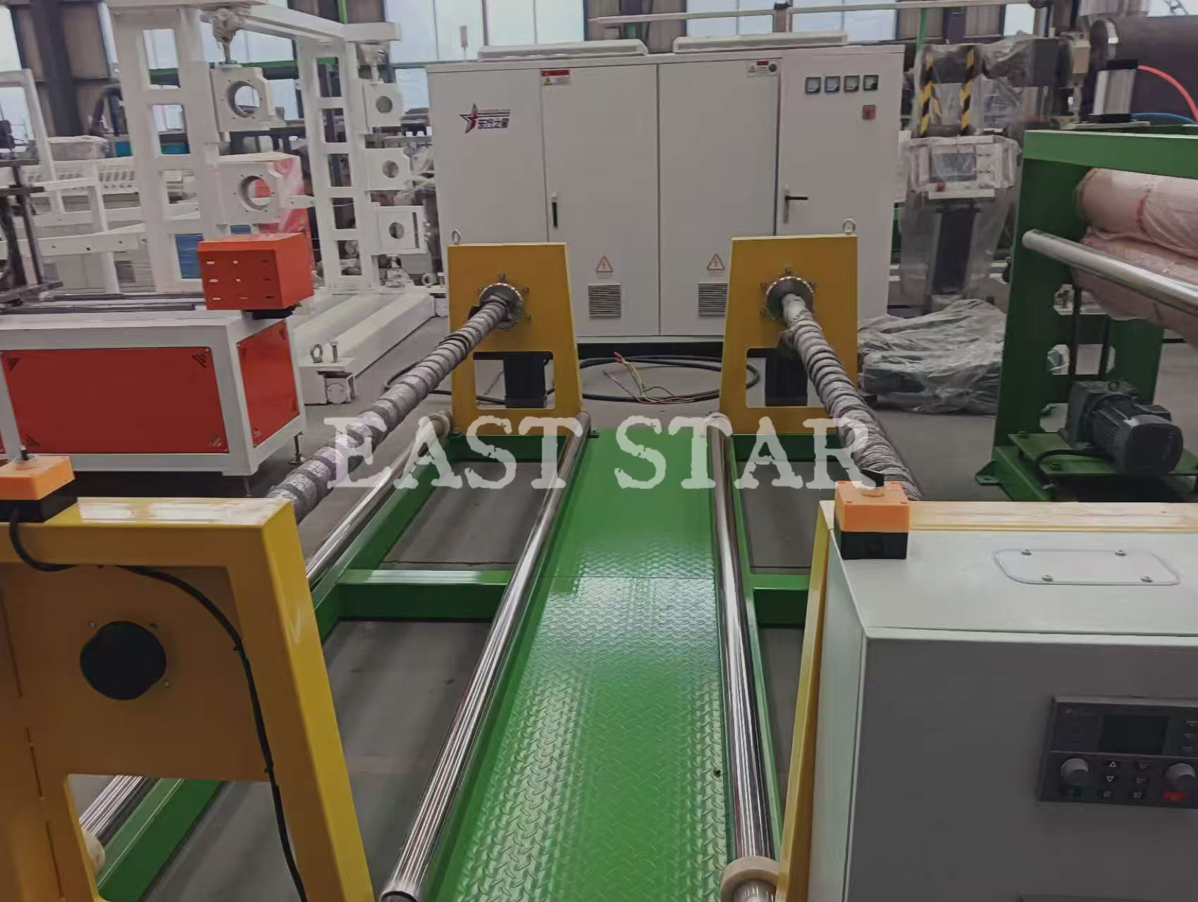 · Триролков каландр: Охлажда и полира разтопения екструдиран лист, като прецизно контролира дебелината и покритието на крайния продукт.