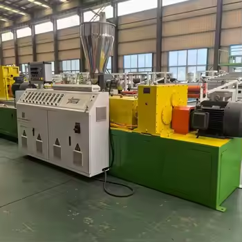 Това е основният етап от целия производствен процес. Смесеният прах се засмуква в бункера на коничен двушнеков екструдер чрез вакуумно зареждащо устройство.
