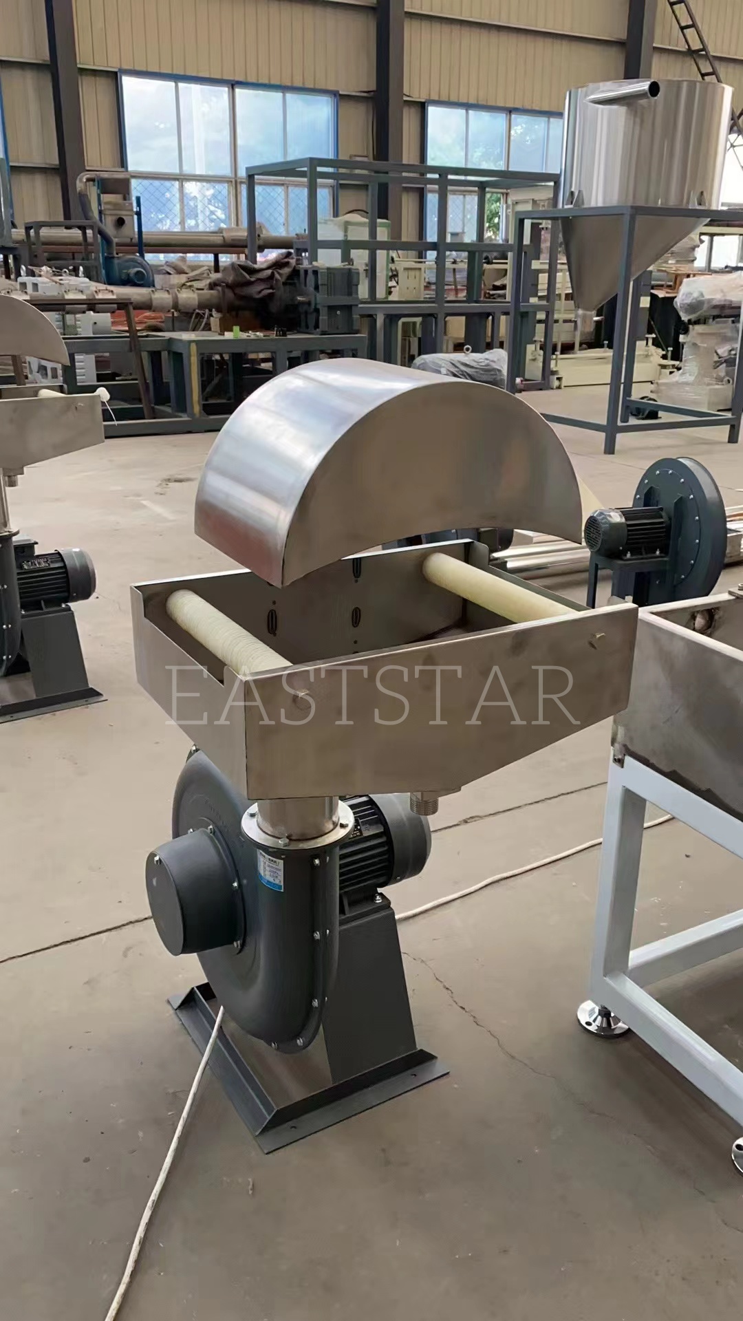 Theпаралелен двушнеков гранулаторвключва двойноспирално дозиращо захранващо устройство с 2,2kW мощност и съотношение на скоростта 17:1, осигуряващо постоянно подаване на материала. За секцията за рязане системата за пластмасово гранулиране използва шаблон с горещо рязане със 72 отвора с диаметър 2,8 mm, допълнен от четири режещи остриета в комплекта на рапирата. Два вентилатора с високо налягане (5,5kW и 4kW) ефективно транспортират пелети през тръби от неръждаема стомана до системите за разделяне и събиране.
