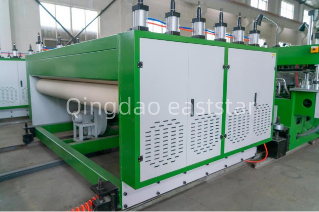 ЦялатаPP панелно оборудване с отворена клеткасъщо включва aхидравличен превключвател на екрана с две станции, аизравняваща фурнаи амощенустройство за въздушно охлаждане. Първата тягова машина е оборудвана с 6 чифта от 12 гумени ролки, всяка с размер на повърхността на ролката ¢250x2300 mm, задвижвани от 7,5 KW мотор. Изравняващата фурна има диапазон на регулиране на температурата от 40℃-150℃, разделен на 16 зони, за да се гарантира плоскостта на дъските. TheЛиния за производство на PP кухи плоскостисъщо е оборудван с машина за напречно рязане и платформа за подреждане за постигане на автоматизирано производство.