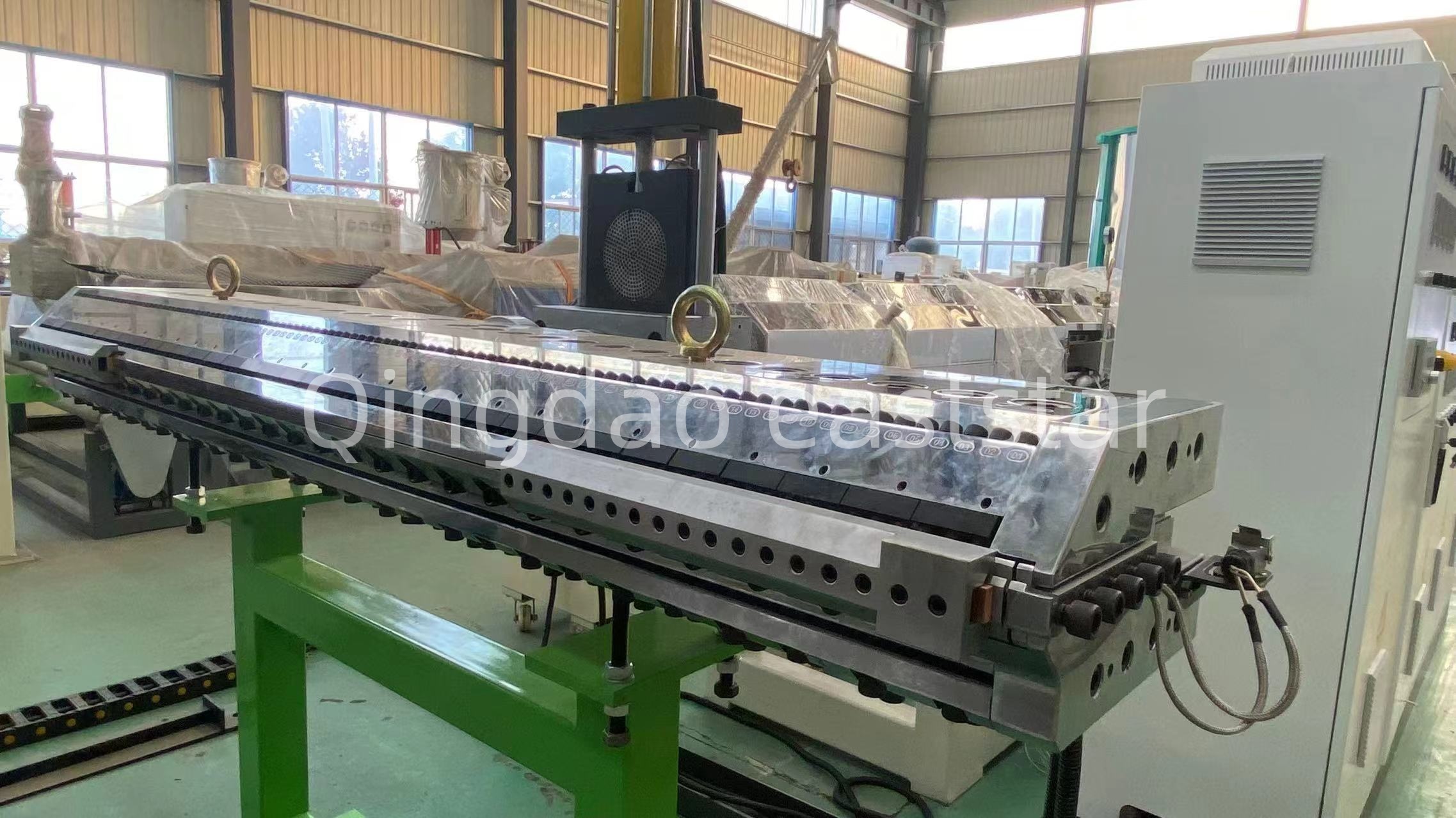 Системата на матрицата наПроизводствена линия за PE дренажни плоскостиприема дизайн на плъзгач тип закачалка за дрехи с ширина на матрицата от 1650 мм, способен да произвежда еднослойни дренажни дъски с дебелина 0,8-1,2 мм. Повърхността на плъзгача на матрицата е хромирана и полирана до огледално покритие, с грапавост на кухината Ra0,1um и грапавост на ръба на матрицата Ra0,05um. Устройството за формоване с две ролки е оборудвано с ролки Φ450 × 1700 mm, с твърдост на повърхността на ролката HRC58-62 и дебелина на хромираното покритие от 0,08 mm. Специален дизайн с множество канали осигурява равномерна температура. Тези професионални конфигурации гарантират, че продуктите за дренажни плоскости, произведени отпроизводствена линияимат равномерна пунктирана структура и стабилна дренажна производителност.