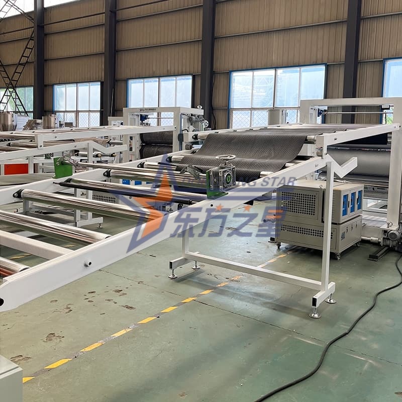 TheTPE Производствена линия за листове против плъзганеизползва MJ-1160 тип закачалка с огледално покритие и каландр с три ролки SG-1200 за прецизна работа. Каналът за потока на формата е хромиран и полиран, за да се осигури равномерно разпределение на стопилката. Каландрът използва ролки с огледално покритие φ400 mm с грапавост на повърхността Ra≤0,025μm. Той прецизно регулира температурата на ролката чрез независима система за контрол на температурата.