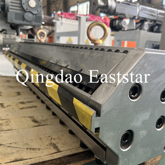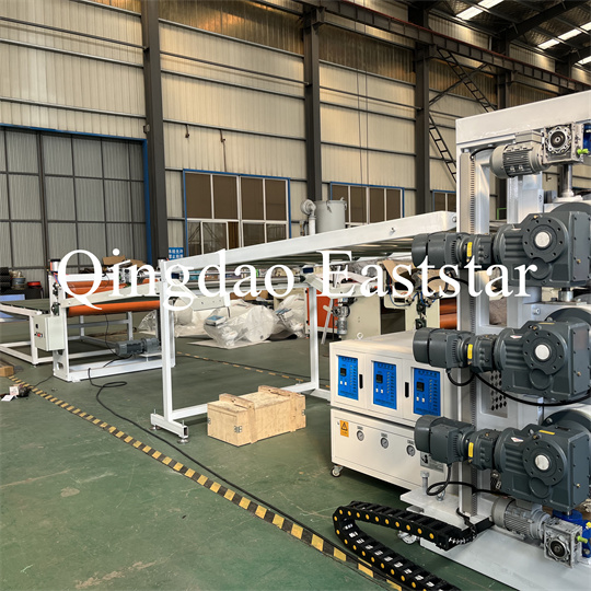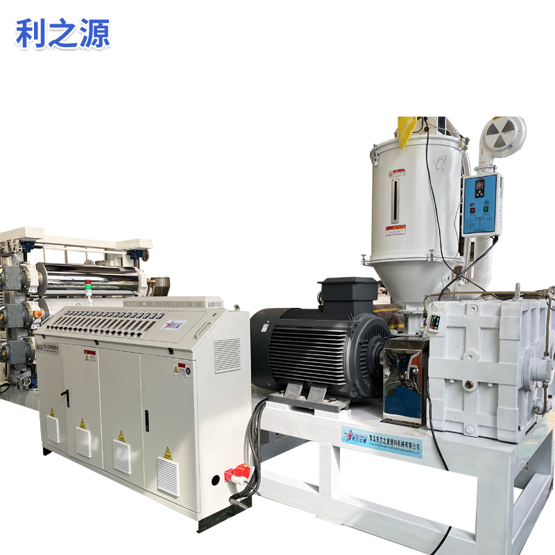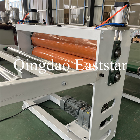 Оборудване за екструдер с мека PVC противоплъзгаща плоча: Оборудването се състои главно от едношнеков екструдер, триролков каландр, 6-метрово охлаждане скоба, машина за теглене с гумени ролки, машина за срязване и устройство за транспортна лента.